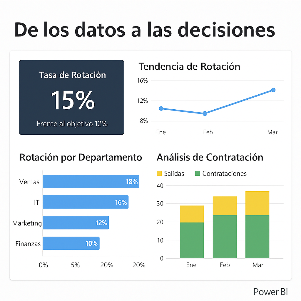 - Storytelling: “La satisfacción cayó 10% después del cambio de política de home office → Impacto directo en rotación de talento clave.”