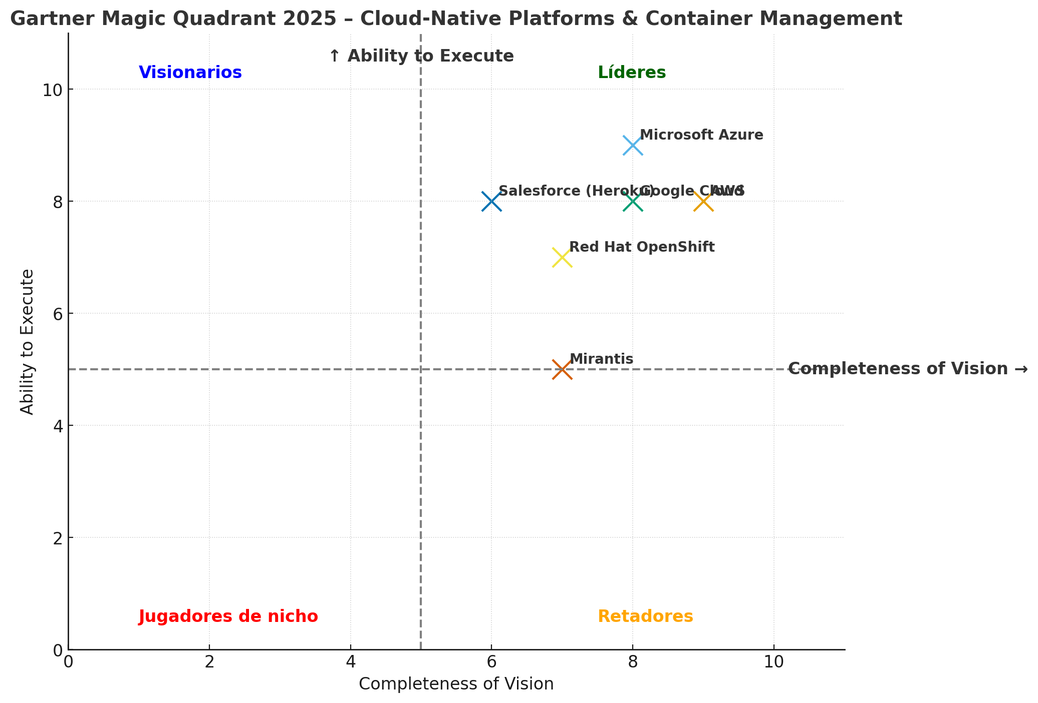 El 2025 Gartner Magic Quadrant para Cloud-Native Application Platforms (CNAP) y Container Management ha confirmado lo que muchos líderes de TI anticipaban: los grandes jugadores de la nube —AWS, Microsoft, Google y Red Hat— se consolidan como Líderes, mientras que proveedores especializados como Salesforce (Heroku) y Mirantis refuerzan el panorama competitivo con propuestas de valor específicas.